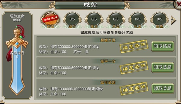 2、领取已完成的成就奖励可增加角色生命值,每项成就增加100点生命值。