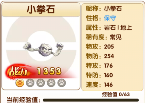 首先是小拳石,推荐性格固执,淘气或开朗也可以,甚至平衡性格也无妨。我深表理解大家刷性格的蛋疼和无奈,但没有比小石头更好抓的宠了吧,打个红血催眠都不用直接丢球搞定,所以给点耐心刷多几次吧。推荐去华蓝市的岩山隧道抓19-20级的。一般进化两只隆隆石成本也不高,落石和地震两招都有不俗输出,打电系绝对爽歪歪,抓鸟也能用到它。