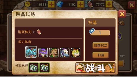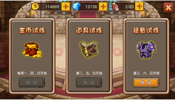 试炼包括3个副本:金币试练、道具试练、装备试练