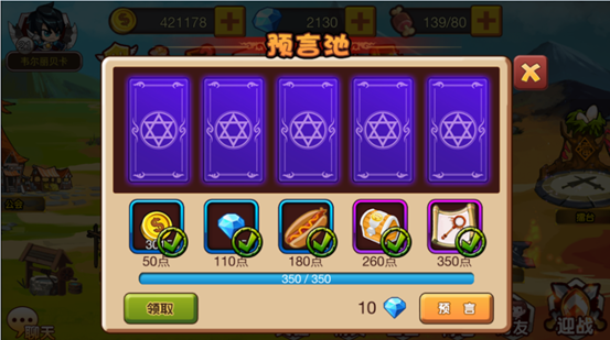 3、5张预言牌分为1、2、3、4、5中点数,达到对应的点数即可领取相应的丰厚奖励;