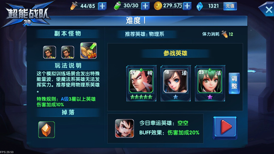 玩家可以点击主界面右侧历练按钮进入日常训练据点破坏关卡。在据点破坏关卡中,所有的小怪boss都受到了某种电磁波影响,法攻英雄无法对他们造成伤害。所以在战斗时,玩家要尽量选择物理型英雄上场。在战斗时还要记得带上当日的幸运英雄,给敌人造成更多的伤害。