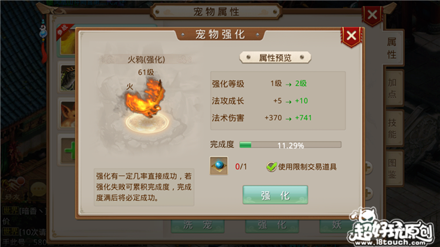 宠物强化是任何宠物都可以进行的。宠物强化的等级越高,强化的成功率就越低。并且宠物强化的等级越高,宠物强化的完成度也就越慢,0级的时候可以直接强化至1级,之后就要强化多次才能进阶了。