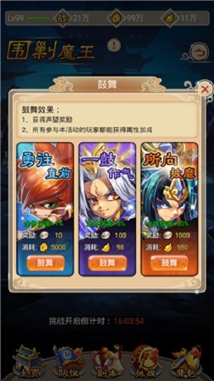 所有玩家都可以使用鼓舞功能来获得增益效果,使用鼓舞后,所有参与围剿的玩家都会获得相应的增益。鼓舞者自身需要花费声望、金币或是元宝等资源来选择鼓舞提升的比例,最高的选择是为参与围剿的玩家提高30%的伤害能力。做了雷锋的玩家自然不会白白的付出,他们将得到声望作为奖励。