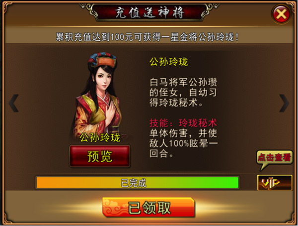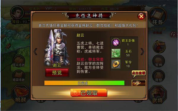 首次充值的会有首充大礼包内有:金色卦象“霸王”1个、玉石500、军令10个、10万铜钱、首充武将包,首充武将包可获得绝版群攻武将赵云。