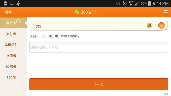 充值方式有6种:银行卡、支付宝、先玩后付、充值卡、骏网卡、360币等。选择充值方式后点下一步进入支付页面即可完成充值。