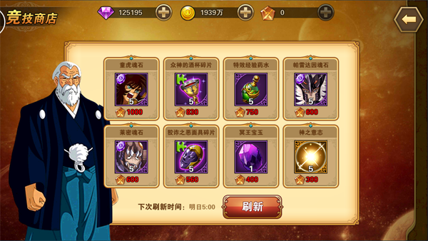 竞技场内有专属的商店,可以通过积攒积分奖励及每日排名奖励获得的古拉杜纪念章来购买商店内出售的魂石及道具。商店内每种道具可购买一次,每日凌晨5:00系统将自动刷新商店内出售的物品,也可以消耗钻石来进行刷新。