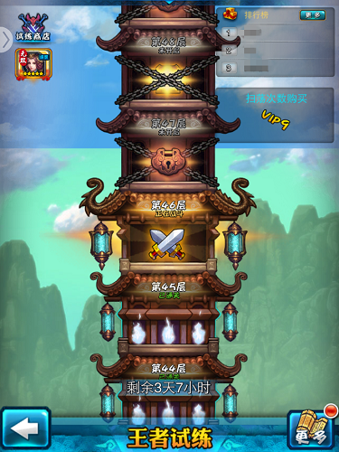 每天只有一次扫荡机会,vip9可以购买一次扫荡。扫荡无法获得宝箱层奖励,骚年们最好到达无法成功闯关的层级时再开始扫荡哦。扫荡后有三种选择领取奖励,分别为普通领取、高级领取、王者领取。