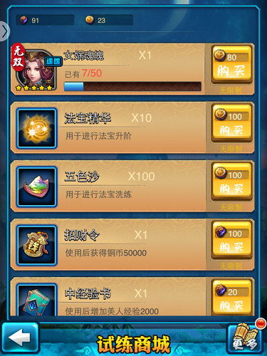 试炼商店:如果说试练塔太遥远,那么试炼商店就能让你感受到无双美人近在眼前,使用试炼精魄就能购买到无双魂魄。不但如此,这里还有法宝进阶所需的法宝精华、洗练所需的五色沙、美人升级所需的经验书、换取铜钱需要的招财令等商城道具,绝对货真价实童叟无欺,重点是购买无上限哦!