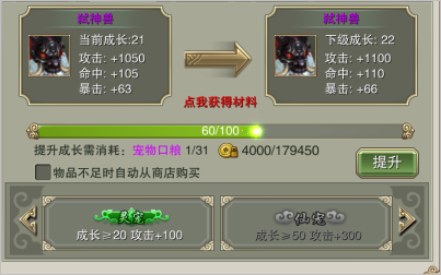 宠物除了宠物等级外,还有成长等级。成长等级需要我们使用宠物口粮才能提升。达到不同的成长等级还可以使宠物进化为灵宠、仙宠等。