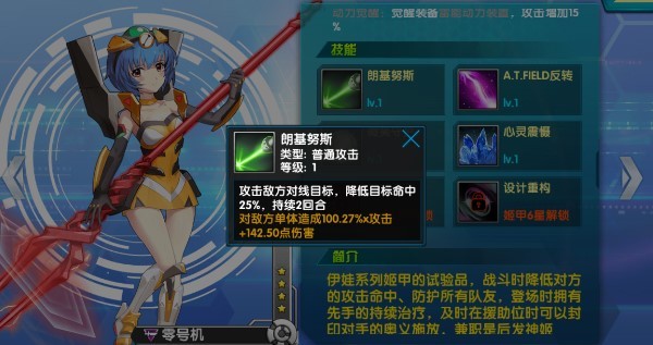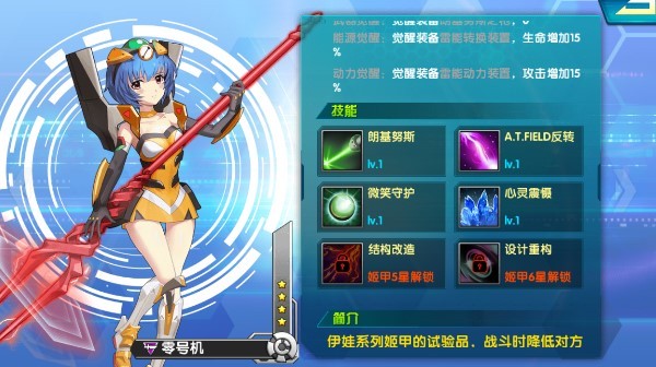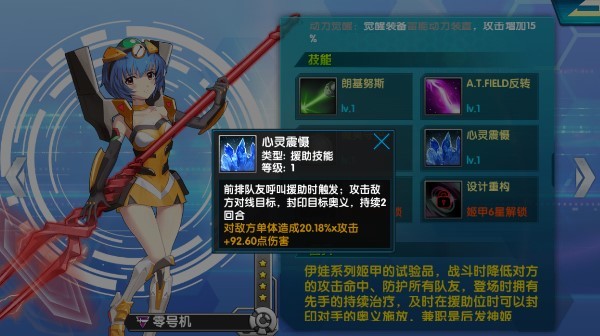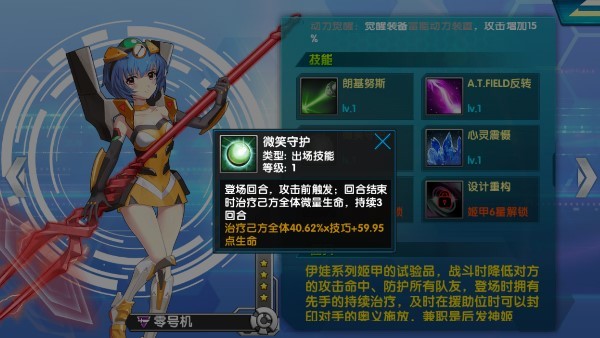 我们的零号机一般情况下可是不会笑的哦,哈哈!开个玩笑,我们的零号机登场时会为全体队员增加一个持续3回合的恢复效果,也就是说从开场我们就带着加血技能跟敌人对阵,有这样的效果有啥理由会输?!哈哈。