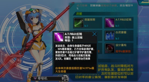 这可是零号机的看家本领,当自己血量低于40%的时候,有50%的概率为己方全体队友施加一个护盾,护盾的生命值为一定量的极限伤害X最大生命值,极限伤害量跟随技能等级而提高,并且最重要的是,如果觉醒了还会给全队的人加血。