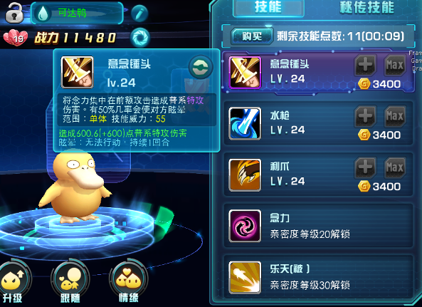 哥达鸭虽然由于呆头呆脑的被不少玩家所嫌弃=。=。。不过用途可是非常之大哟~~其单体攻击非常强力,属性克制的情况下一招带走一只是常有的事,作为大招的意念拳头在释放后可以眩晕敌方怪物一回合。非常好用~~。