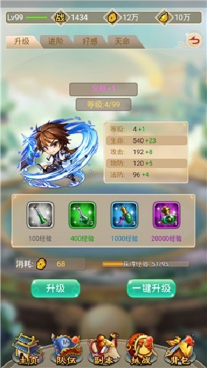升级自然就是提高伙伴的等级,我们在剧情副本中获得的各种经验丹就是为此服务的。在升级的界面中,我们可以看到伙伴的当前等级和当前上限,当前上限是受到主角等级制约的,伙伴的最高等级不能超过主角。同时我们可以在界面上看到伙伴升级属性将发生什么改变,可以说伙伴升级时提高的属性数值并不算高,但是积少成多就会比较喜人了。