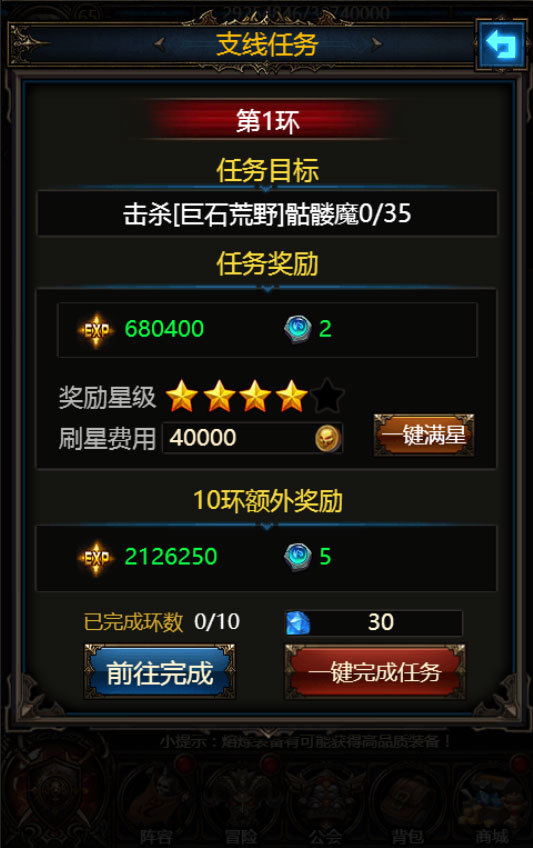 在《暗黑之王》中支线任务其实就是跑环任务啦,每天可以完成10次,可以获得大量的经验。 10环,就是10个任务,每个任务的星级是独立的。 要想获得最大经验,必不可少的是要花一些金币哦,把任务刷成..