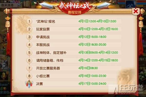 在 3 月 26 日的《梦幻西游》手游欢乐盛典上,代言人林更新为我们剧透了《梦幻西游》手游全新 PK 盛会武神坛即将问世的消息,而在 4 月 1 日,这一赛事将正式与我们相见。《梦幻西游》手游武神坛联赛,是集合了每个服务器顶级力量的全新规则联赛。在这一赛事中,参赛玩家需要经历”武神坛“报名、玩家投票、申请挑战、本服挑战、战神附体,指定替补、调用储备箱,传党、开放比赛服务器、小组比赛、决赛赛事流程。从报名阶段开始,每一届联赛需要持续整整一个月的时间。只有经过这一个月的漫长考验走到最后的团队,才能成为真正意义上的“武神坛英雄”。
