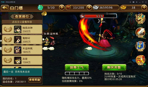 白门楼,三分天下:白门楼开启时间为每日中午12点整,玩家每天可免费攻打吕布10次(2小时累计一次,最多10次),每次都会获得造成伤害对应的银两及50魔王币(换取资源),如果觉得奖励不够,还可以花费10元宝继续攻打,鼓舞(10元宝一次)可增加对吕布的伤害,伤害越高,银两越多,是大量的银两来源之一。三分天下,每天晚上7点开启到7点半结束,随机分配国家,然后随机匹配不同国家的玩家进行对战。赢了有积分,输了也有一点积分,连续胜利将会增加积分获得。积分可用于三分天下商店兑换大量的资源,活动只有半个小时,有空的玩家一定别错过。
