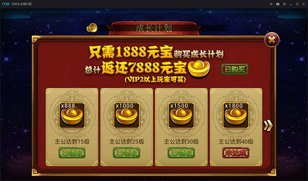 成长特权:VIP2开启,花1888元宝购买(其实到了V2,游戏中送的元宝足够开启),然后分别在15级(返还888)、25级(返还1000)、30级(返还1500)、40级(返还1800)、50级(返还2700)从15级到50级一共返还7888元宝,而且V2不需要花太多的钱,缺元宝的可以投资。长期玩的朋友一定要拿下,保证前期元宝的充足。(以上数据均为封测数据,公测如果变更请留意)