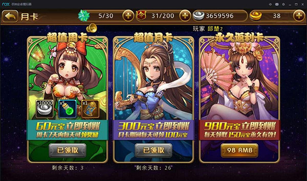 月卡:分为三种,周卡(6元7天,每天可领取1万银两、5个经验药水、一个兵符),月卡(30元30天每天可领取100元宝),永久返利卡(98元开启,每天返利150元宝),充值的金额对应的元宝也会快速到账,相当于游戏的理财把,长期投资。推荐新手先拿下30元的月卡到V2开启成长投资,然后迎娶白富美,出任CEO,走上人生巅峰。
