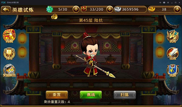 问鼎中原,英雄试炼:玩家可以在问鼎中原中获取大量的资源,有武将进阶升星材料,有武将升星药水以及大量的功勋。通关三星之后,每日扫荡即可,上线必做。其中的领地讨伐,有实力的每天都可以试一试,只要通关就会有大量奖励,通关后可以用武将巡逻,获得武将信物,不过需要花费一定的精力和大量的时间巡逻。英雄试炼中,玩家每日可攻打,不限次数,越往后面越难,需要玩家强化实力然后继续攻打,层数越高,获得的奖励就越多。实在过不去的就重置关卡扫荡,重新得到相应的奖励,每天5次,0点刷新,玩家千万别忘记重置扫荡关卡。