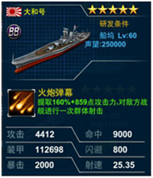 大和号,粉丝一大堆的战列舰,就算不是军迷也知道他的名字,名气大,加上其本身是平民玩家能够拿到的最高属性船决定他的性价比是十分高的。图鉴的命中属性也十分重要,很多土豪玩家也还在用它。4412的攻击力比起常规的5星船来说高出太多了,技能火炮弹幕能造成非常可观的面杀伤害,高攻击能利用聚气快的优势,迅速发出火炮弹幕去支援其他舰船的攻击技能点杀对手。装甲更是高达11万之多,生存能力有效得到保障,在强力的5星日本将配合下,大和号可以说表现相当不错了,平民玩家必出。使用方法:
