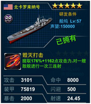 北卡罗来纳号,美国的第一艘三连击船,好吧三连击党们可以伸手买了。尤其是平民。但是这个船最后会被密苏里代替。攻击,装甲,技能百分比都比提尔比茨来的高,但是必须要57级才能建造,由于密苏里出来的时间还要更晚,所以先用用他也没啥不可以,毕竟船坞可以造。没有碎片成本。使用方法: