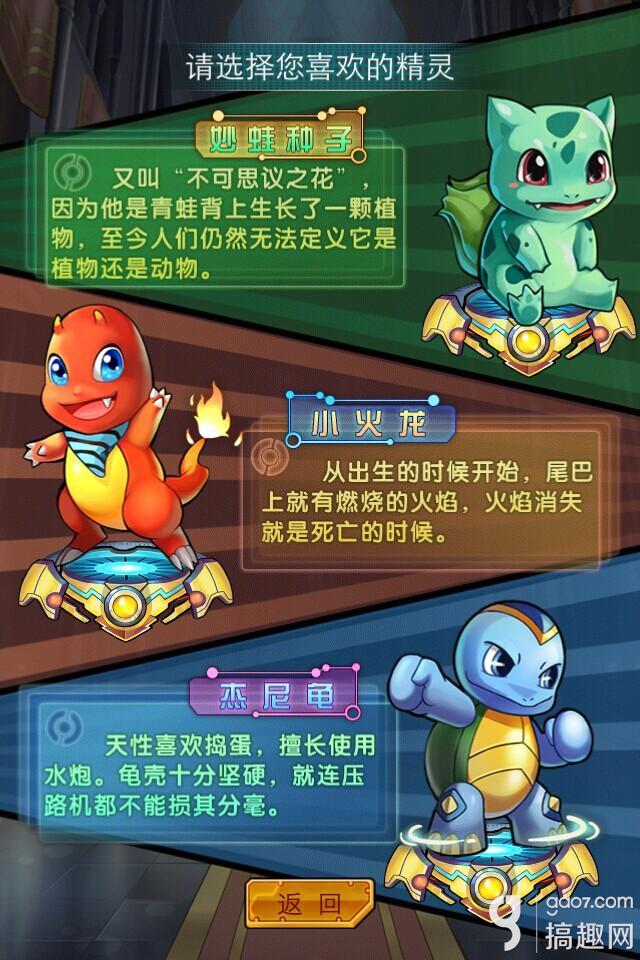首先,经过一段华丽的动画,我们要进入精灵世界了,激动ing…游戏初期为我们提供了很强大的三主宠,小火龙,杰尼龟,秒蛙种子。