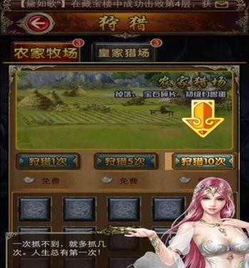 进入之后会有看到一个农家牧场的场景,然后是能够提供你狩猎的次数,分别是1次,5次,10次,都是免费的哦,一次抓不到,就多抓几次撒!点击狩猎十次,获得了3中石头碎片,还有4个低级的幻兽蛋,