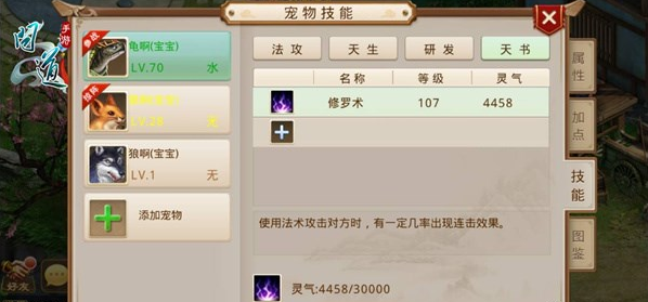 法系宠物的天书选择比较固定,可能也是法术攻击的天书较少的原因。一般都以提升宠物伤害为选择标准,推荐“怒击”、“降魔斩”和“修罗术”。