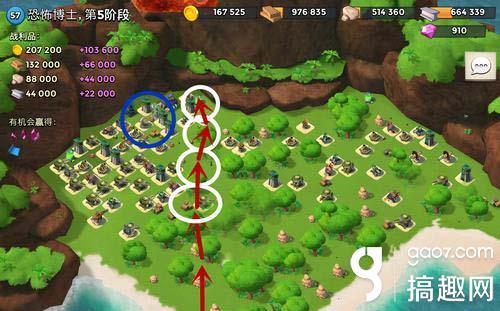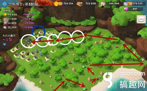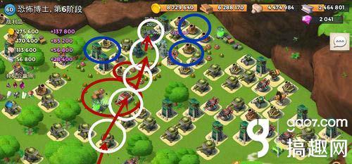 难度也不大,左右两侧都可以登陆。野人右侧登陆后,冻住蓝圈处,拆掉狙击塔,直接引导到最右侧角落即可安全输出。