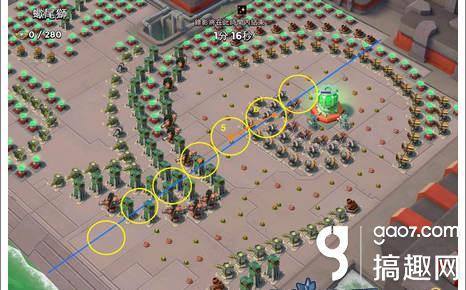 这点是非常关键的。贴吧玩家老达子曾经发过这个实验的视频。这个游戏中防御第一次看见攻击对象的时候会楞一秒钟。这个设置估计是SC用来解决压岸防御过猛而设计的(没有这个发愣打压岸防御会非常吃力,烟雾震爆过了好几秒兵都还没走下船)。这个“1秒发愣”对一人一炮法至关重要。如果到本后一次都没有露过脚,妹子会在火箭菊花开火之前齐射(妹子自己也要1秒瞄准时间,对付喷火、机关枪等无瞄准时间的防御不行)。但是一旦露过脚,火箭等就不再有发愣的这一秒,会在妹子发射之前秒死妹子。这个现象在失误的7号队员的回放中可以清楚地看到,烟雾散后妹子来不及发射第一发就被火箭秒死,而其他没露脚的队员是来得及的。