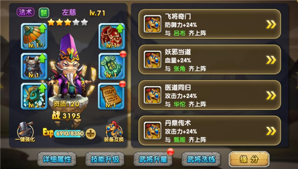 左慈其缘分也相当牛掰,他和神将吕布、华佗、张角、甄姬都有缘分属性加成,这使得左慈一上阵就能完美的替换任意一名武将。有了仙人左慈,制霸三国不再是梦!