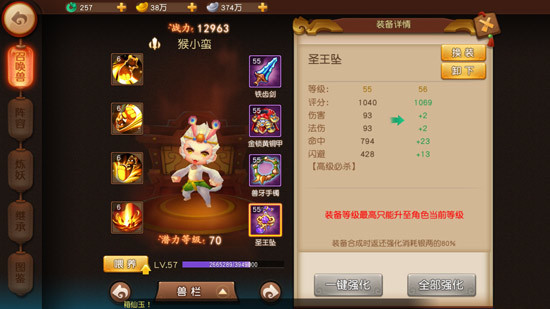 然后每个品质的宝宝装备评分会相差甚远,像同样是55级的金装和紫装,金装评分1822,紫装评分1040