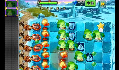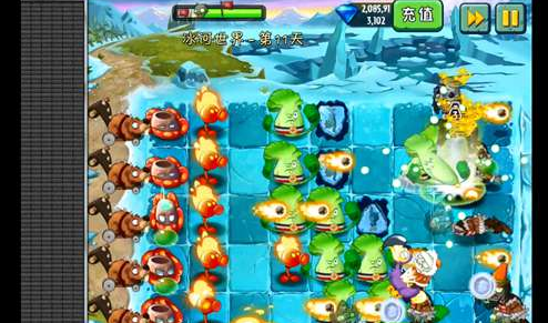 由于火焰豌豆射手不仅不会被冰冻风冰冻,更有短时间为周围植物加热的功能,因此,后排优先放上两个火焰豌豆在图上的位置,这样后院就起火了,我们也就放心了(哪里不对)。