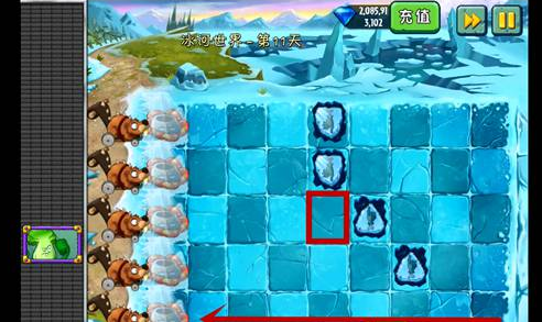 然后是浮冰的位置,从中可以看出,本关僵尸能够行走的路线只有下方的一行,其余的都会被强制移动到红色方框的位置。