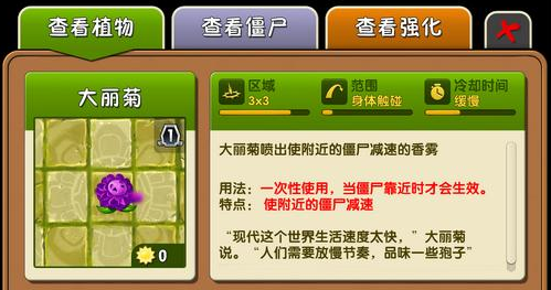 普通攻击:大丽菊喷出使附近的僵尸减速的香雾。 一次性使用,当僵尸靠近时才会生效