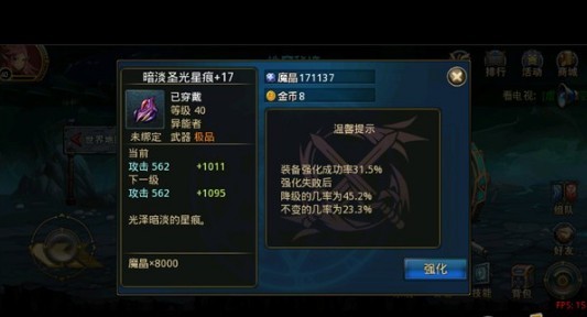 根据系统消息强化:这个方法其实很简单,就是等系统消息出来的时候,等待5秒,在5秒到8秒的时候强化装备的成功率是比较高的,但是3秒钟内只能成功一次,速度要快,如果你的网络状况不是很好的话,不建议使用本技巧。
