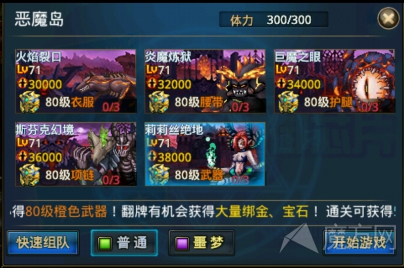 炎魔炼狱L71,推荐战力32000。介绍:首杀必得70级橙色腰带,翻牌有机率获得大量绑金、宝石!通关可获得4950000经验!(噩梦关卡产出勇者宝石、猎人宝石!)