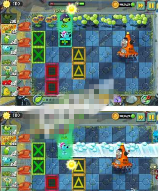 这是在国际版中玩家们会遇到的问题,其实这个x是一个特殊的地砖哦,植物如果是种在2个一模一样的地砖的时候,就可以将能量豆用在相应的地砖上,与之相配的植物就会发挥到能量豆的作用哦,现在来看下例图。