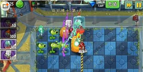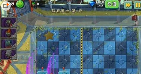 2、难点:在中间放一个路障僵尸,再放电磁盾僵尸。因为先放路障僵尸可以先触发弹簧豆,而护盾在这里就有很好的作用了。然后在护盾的作用下,在下面放一个普通僵尸来触发第2个地雷。