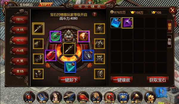 镶嵌流程为:选择部位——选择背包内将镶嵌的宝石——点击镶嵌按钮。