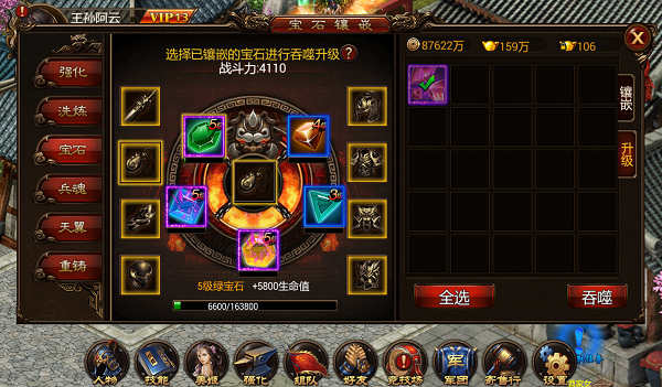 已镶嵌的宝石可以通过吞噬玉髓和同类型的宝石提升宝石等级。