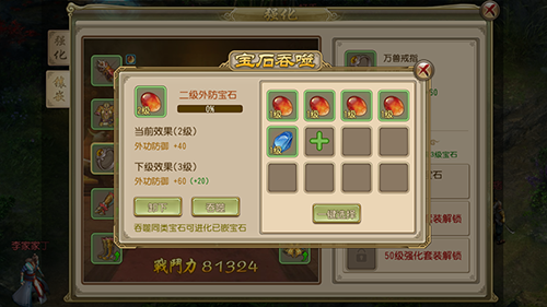 通过吞噬宝石,可以增加宝石的品级。例如一级宝石升级到二级宝石,就需要吞噬两个一级宝石,宝石的种类不需要一样。