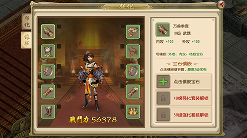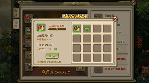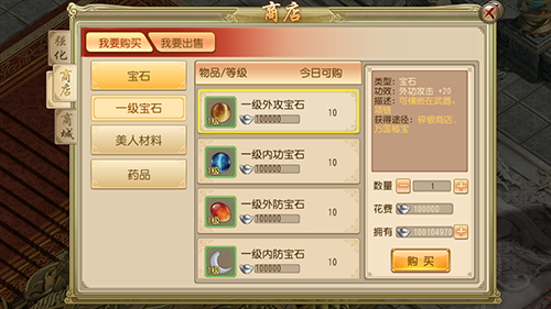点开镶嵌宝石按钮后,如果没有宝石会跳转到商城,购买宝石需要花费大量的银两。宝石种类很多,有增加外攻的、增加内防的甚至增加生命指的,如何个性化自己的英雄,就看各位客官的选择了。