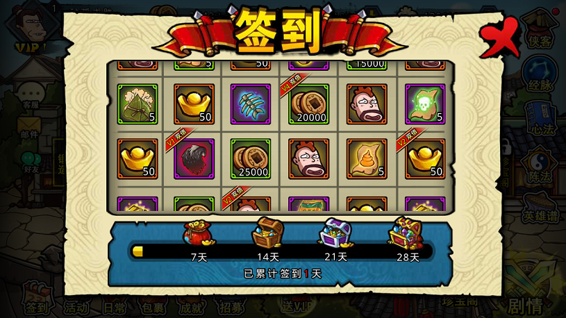 元宝就是生产力,元宝就是战斗力!《一桶浆糊》累计登录签到7天,每天领取元宝和VIP经验,7天领取至少V5,给你论贱紫禁之巅的底气!