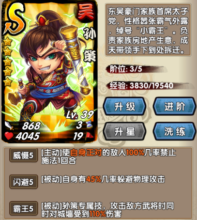 强控拆屋工 古有西楚霸王!现有东吴小霸王!完美的配套技能设计威慑让对方只能用物理攻击威胁孙策,闪避又是物理攻击的天敌。独有的霸王技能可以在打击对方卡片的同时直接攻击对方城墙,使用得当的话,对方很可能愤懑而败。