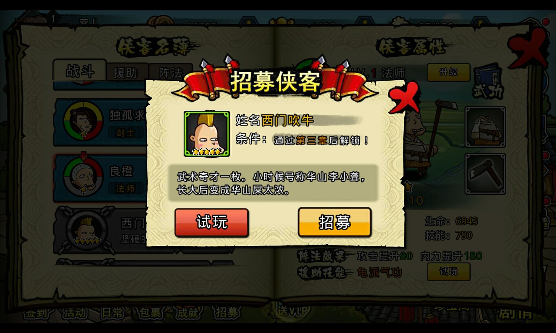 战斗的成败,往往决定于我们对所使用侠客的熟练度,每位侠客都有着自己独特的4个技能以及终极奥义。那么侠客试玩无疑让我们能在即使还没有拥有该侠客的情况下就能够选取该侠客进行练习。在后续一桶浆糊的路上为我们铺平了道路!可谓是功不可没啊!