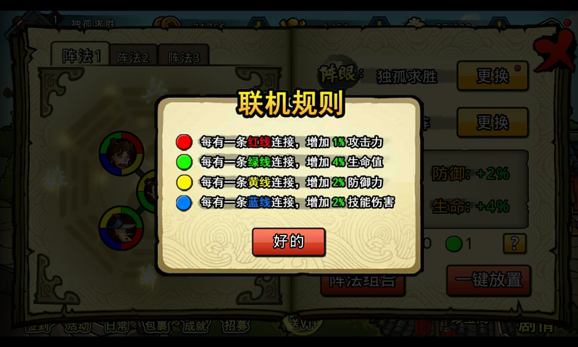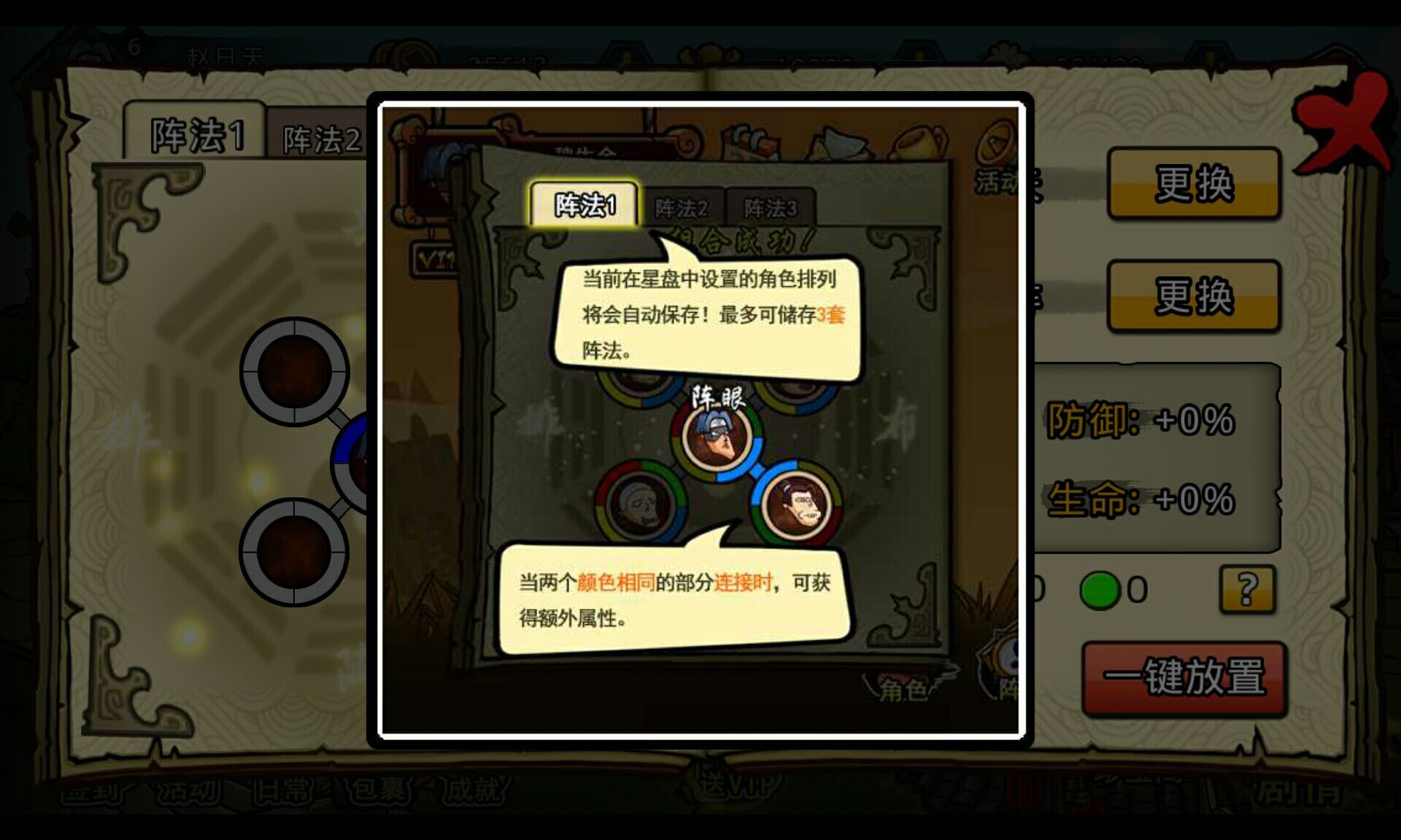 如上图中所看到的,阵法可以储存3套,可以在不同的时候自由进行选择,而阵法的加成取决于两个颜色相同的部分连接。