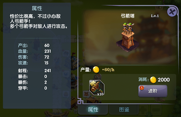 升级防御塔能大幅度提升防御塔的属性,从而使自己城池的防守能力得到加强。防御塔升级后还能让增加雕像的金币产出。