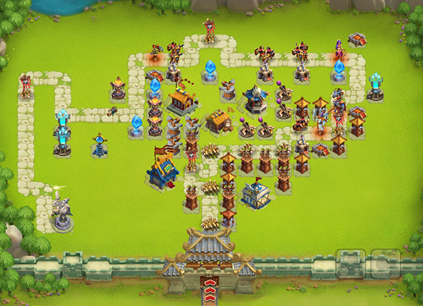 防守守不住其实有很大部分原因是阵型的问题。路径的规划,防御塔的摆放这些都会影响咱们的防御能力。什么时候集火,什么时候释放计谋和武将技能都很关键。个人觉得可以设置多个集火点,同时不要忽略防空,试着把城池中的功能建筑拿来引诱敌方单位攻击,摆放合适的功能建筑基本能废掉对面的弓箭兵。同时要合理利用游戏中路径的拐弯处,把塔放在拐点处它的有效攻击范围会更大。下图就是一个充分利用拐弯处最大化利用防御塔的攻击范围的例子,只是雕像旁边没有防御,容易被飞行单位和张辽这种英雄突袭。但是它的其他区域的摆放还是很不错的,防御的时候无法趋于完美,因为进攻方式可以根据你的基地来选择进攻策略的,我们只能找个合理的放置能击败大部分进攻者即可。