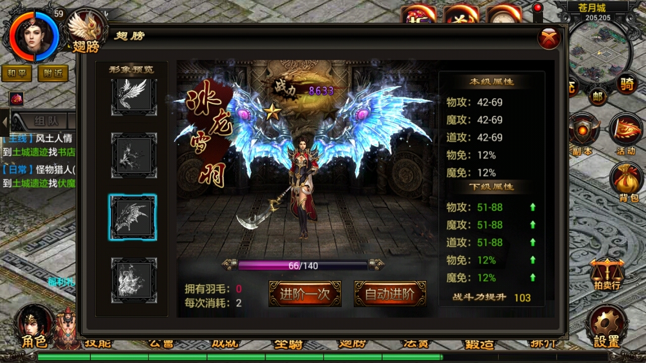 消耗羽毛来升级翅膀,同时获得更绚丽的外形和更强附加属性。